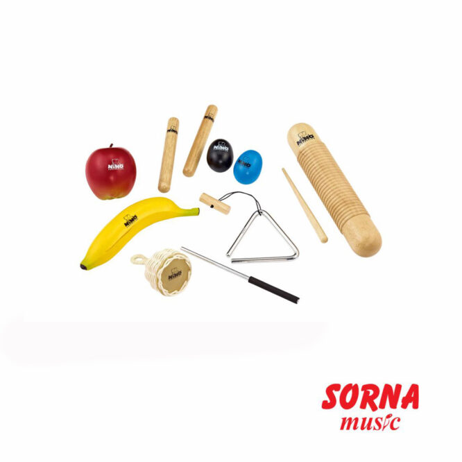 1 x 1Wood Guiro (NINO555)، 1 x Caxixi (NINO501)، 1 x Wood Claves (NINO502)، 1 x Triangle (NINO550)، 1 x تخم مرغ (NINO540LB)، 1 x تخم مرغ (NINO540LBK)، 1 x ” شیکر موز (NINO597)، 1 عدد شیکر سیب (NINO596)، 1 عدد کیف